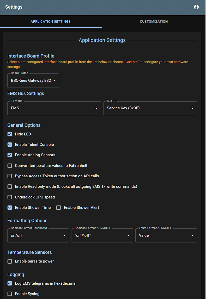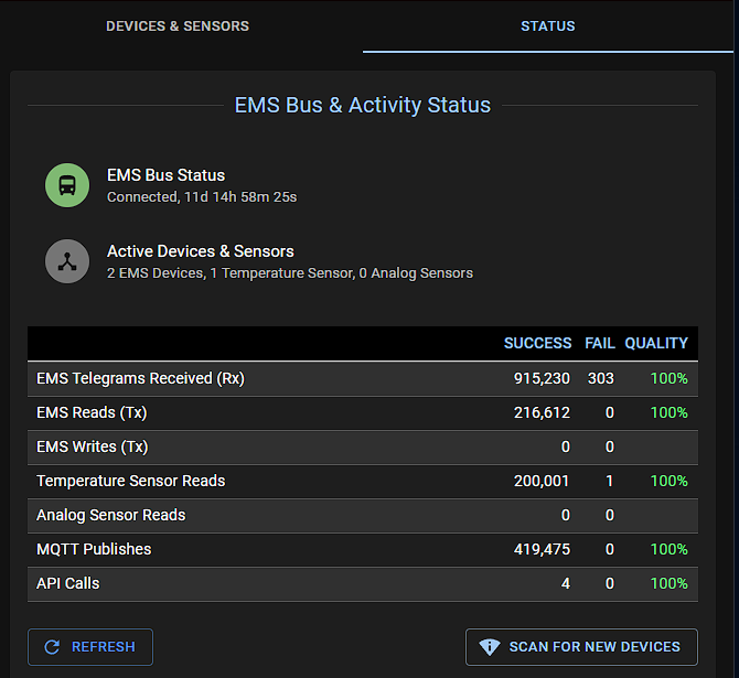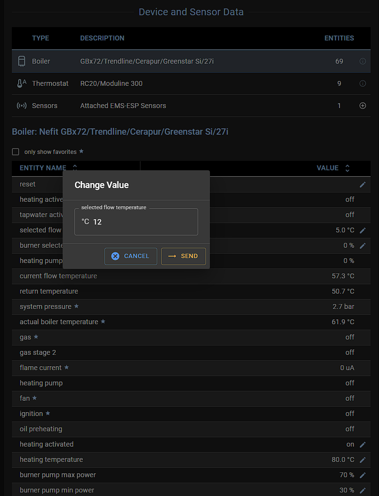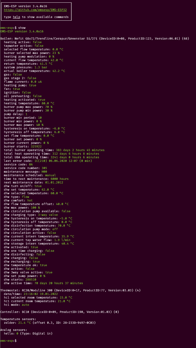 # ![logo](media/EMS-ESP_logo_dark.png) **EMS-ESP** is an open-source firmware for the Espressif ESP8266 and ESP32 microcontroller that communicates with **EMS** (Energy Management System) based equipment from manufacturers like Bosch, Buderus, Nefit, Junkers, Worcester and Sieger. This project is the specifically for the ESP32. Compared with the previous ESP8266 (version 2) release it has the following enhancements: - Ethernet Support - Pre-configured circuit board layouts - Supports writing EMS values directly from within Web UI - Mock API server for faster offline development and testing - Improved API and MQTT commands - Improvements to Dallas temperature sensors - Embedded log tracing in the Web UI [![version](https://img.shields.io/github/release/emsesp/EMS-ESP32.svg?label=Latest%20Release)](https://github.com/emsesp/EMS-ESP32/blob/main/CHANGELOG.md) [![release-date](https://img.shields.io/github/release-date/emsesp/EMS-ESP32.svg?label=Released)](https://github.com/emsesp/EMS-ESP32/commits/main) [![license](https://img.shields.io/github/license/emsesp/EMS-ESP32.svg)](LICENSE) [![Quality Gate Status](https://sonarcloud.io/api/project_badges/measure?project=emsesp_EMS-ESP32&metric=alert_status)](https://sonarcloud.io/summary/new_code?id=emsesp_EMS-ESP32) [![Codacy Badge](https://app.codacy.com/project/badge/Grade/9441142f49424ef891e8f5251866ee6b)](https://www.codacy.com/gh/emsesp/EMS-ESP32/dashboard?utm_source=github.com&utm_medium=referral&utm_content=emsesp/EMS-ESP32&utm_campaign=Badge_Grade) [![downloads](https://img.shields.io/github/downloads/emsesp/EMS-ESP32/total.svg)](https://github.com/emsesp/EMS-ESP32/releases) [![chat](https://img.shields.io/discord/816637840644505620.svg?style=flat-square&color=blueviolet)](https://discord.gg/3J3GgnzpyT) If you like **EMS-ESP**, please give it a star, or fork it and contribute! [![GitHub stars](https://img.shields.io/github/stars/emsesp/EMS-ESP32.svg?style=social&label=Star)](https://github.com/emsesp/EMS-ESP32/stargazers) [![GitHub forks](https://img.shields.io/github/forks/emsesp/EMS-ESP32.svg?style=social&label=Fork)](https://github.com/emsesp/EMS-ES32P/network) [![donate](https://img.shields.io/badge/donate-PayPal-blue.svg)](https://www.paypal.com/paypalme/prderbyshire/2) Note, EMS-ESP requires a small hardware circuit that can convert the EMS bus data to be read by the microcontroller. These can be ordered at or contact the contributors that can provide the schematic and designs. --- # **Features** - A multi-user secure web interface to change settings and monitor incoming data - A console, accessible via Serial and Telnet for more advanced monitoring - Native support for Home Assistant and Domoticz via [MQTT Discovery](https://www.home-assistant.io/docs/mqtt/discovery/) - Can run standalone as an independent WiFi Access Point or join an existing WiFi network - Easy first-time configuration via a web Captive Portal - Support for more than [100 EMS devices](https://emsesp.github.io/docs/#/Supported-EMS-Devices) (boilers, thermostats, solar modules, mixer modules, heat pumps, gateways) ## **Demo** See a demo [here](https://ems-esp.derbyshire.nl). Log in with any username/password. # **Screenshots** ## Web Interface | | | | ---------------------------------- | -------------------------------- | | | | | | | | | | ## Telnet Console ## In Home Assistant # **Installing** Refer to the [official documentation](https://emsesp.github.io/docs) to how to install the firmware and configure it. The documentation is being constantly updated as new features and settings are added. You can choose to use an pre-built firmware image or compile the code yourself: - [Uploading a pre-built firmware build](https://emsesp.github.io/docs/#/Uploading-firmware) - [Building the firmware from source code and flashing manually](https://emsesp.github.io/docs/#/Building-firmware) # **Support Information** If you're looking for support on **EMS-ESP** there are some options available: ## Documentation - [Official EMS-ESP Documentation](https://emsesp.github.io/docs): For information on how to build and upload the firmware - [FAQ and Troubleshooting](https://emsesp.github.io/docs/#/Troubleshooting): For information on common problems and solutions. See also [BBQKees's wiki](https://bbqkees-electronics.nl/wiki/gateway/troubleshooting.html) ## Support Community - [Discord Server](https://discord.gg/3J3GgnzpyT): For support, troubleshooting and general questions. You have better chances to get fast answers from members of the community - [Search in Issues](https://github.com/emsesp/EMS-ESP32/issues): You might find an answer to your question by searching current or closed issues ## Developer's Community - [Bug Report](https://github.com/emsesp/EMS-ESP32/issues/new?template=bug_report.md): For reporting Bugs - [Feature Request](https://github.com/emsesp/EMS-ESP32/issues/new?template=feature_request.md): For requesting features/functions - [Troubleshooting](https://github.com/emsesp/EMS-ESP32/issues/new?template=questions---troubleshooting.md): As a last resort, you can open new _Troubleshooting & Question_ issue on GitHub if the solution could not be found using the other channels. Just remember: the more info you provide the more chances you'll have to get an accurate answer # **Contributors ✨** EMS-ESP is a project originally created and owned by [proddy](https://github.com/proddy). Key contributors are: