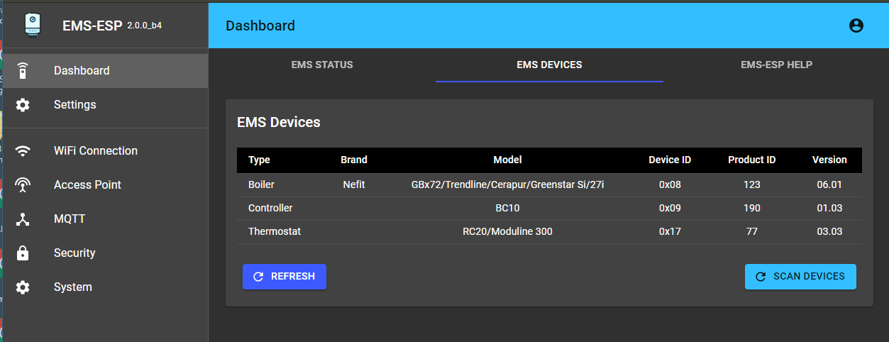 # EMS-ESP version 2.0 ## **Breaking changes** - MQTT base has been removed. The hostname is only used. ## **New Features in v2** - A new web interface using React and TypeScript that's now secure as each URL endpoint is protected by issuing a JWT which is then sent using Bearer Authentication. Using a Captive Portal in AP mode or connecting to a local wifi network. - A new console. Like in version 1.9 it works with both Serial and Telnet but with a more intuitive Linux shell like behavior. It supports multiple connections and has basic security to prevent any changes to EMS-ESP. A full list of commands is below, here are the key ones: * `help` lists the commands and keywords * some commands take you into a new context, a bit like a sub-menu. e.g. `system`, `thermostat`. Use `help` to show which commands this context has and `exit` or CTRL-D to get back to the root. * To change a setting use the `set` command. Typing `set` shows the current settings. * `show` shows the data specific to the which context you're in. * `su` to switch to Admin which enables more commands such as most of the `set` commands. The default password is "ems-esp-neo" which can be changed with `passwd` from the system menu. When in Admin mode the command prompt switches from `$` to `#`. * `log` sets the logging level. `log off` disables logging. Use `log debug` for debugging commands and actions. * `watch` will output the incoming Rx telegrams to the console. You can also show these in its 'raw' data format and also watch a particular ID. * CTRL-D to exit, CTRL-U to remove line, TAB to auto-complete - There is no "serial mode" anymore like with version 1.9. When the Wifi cannot connect to the SSID it will automatically enter a "safe" mode where the Serial console is activated automatically (baud 115200). Note Serial is always available on the ESP32 because it has multiple UARTs. - The onboard LED behaves like in 1.9. A solid LED means good connection and EMS data is coming in. A slow pulse means either the WiFi or the EMS bus is not connected yet. A very fast pulse is when the system is booting up and configuring itself, which typically takes 5 seconds. - Built to work with both EMS8266 and ESP32 - Extended MQTT to use MQTT discovery on Home Assistant. - For debugging there is an offline mode where the code can be compiled and executed standalone without uploading to an ESP controller. Use `make` (based off GNUMakefile). ## **Uploading the firmware** - If you're not using PlatformIO, use the command-line and Python. You can download Python from https://www.python.org/downloads/. Make sure you also get: - `esptool`, install using the command `pip install esptool` - and for OTA updates later, `espota` from https://github.com/esp8266/Arduino/blob/master/tools/espota.py - Grab the latest firmware binary from https://github.com/proddy/EMS-ESP/releases/tag/travis-v2-build - Uploading directly via USB. For ESP8266: `esptool.py -p -b 921600 write_flash 0x00000 ` For ESP32: `esptool.py --chip esp32 --port "COM6" --baud 921600 --before default_reset --after hard_reset write_flash -z --flash_mode dio --flash_freq 40m --flash_size detect 0x1000 XX\.platformio\packages\framework-arduinoespressif32\tools\sdk\bin\bootloader_dio_40m.bin 0x8000 XX\.pio\build\esp32\partitions.bin 0xe000 XX\.platformio\packages\framework-arduinoespressif32\tools\partitions\boot_app0.bin 0x10000 ` - Uploading over WiFi: `espota.py --debug --progress --port 8266 --auth ems-esp-neo -i -f ` ## **Setting EMS-ESP up for the first time** - Connect to the Access Point called ems-esp using the WPA password `ems-esp-neo`. When you see the captive portal sign-in with username `admin` and password `admin`. Set the WiFi credentials and restart the ESP. - When it connects to your wifi network you can use either the Web UI to further configure the other settings or using Telnet. If using the Telnet console refer to the full set of commands below. To change any settings you need to be admin which can be accessed via the `su` command. The password here is the same as the JWT secret from the Web UI, default `ems-esp-neo`. ## **List of console commands** ``` common commands available in all contexts: exit help log [level] watch [ID] su (from the root) set refresh system (enters a context) boiler (enters a context) thermostat (enters a context) scan devices [deep] send telegram <"XX XX ..."> set bus_id set tx_mode show show devices show ems show values system set show show mqtt passwd restart set wifi hostname set wifi password set wifi ssid boiler comfort flowtemp wwactive wwcirculation wwonetime wwtemp read thermostat set set master [device ID] mode [heating circuit] temp [heating circuit] read ``` ---------- ### **Basic Design Principles** - The core services like telnet, logging and shell are based off the libraries from @nomis. I also adopted his general design pattens such as making everything as asynchronous as possible so that no one operation should starve another operation of it's time to execute (https://isocpp.org/wiki/faq/ctors#static-init-order). - All EMS devices (e.g. boiler, thermostat, solar modules, mixing units etc) are derived from a factory base class and each class handles its own registering of telegram and mqtt handlers. This makes the EMS device code easier to manage and we can extend with new telegrams types and features. ### **Things to tidy up in code later** - Replace vectors of class objects with shared pointers and use emplace_back since it instantiates during construction. It may have a performance gain. - Add real unit tests using platformio's [pio-remote](https://docs.platformio.org/en/latest/plus/pio-remote.html) test bed. - See if it's easier to use timers instead of millis() based timers, using [polledTimeout](https://github.com/esp8266/Arduino/blob/master/libraries/esp8266/examples/BlinkPolledTimeout/BlinkPolledTimeout.ino). - Port over to ESP-IDF. The Arduino SDK is showing its limitations ### **Features to add** - Multi-language. G