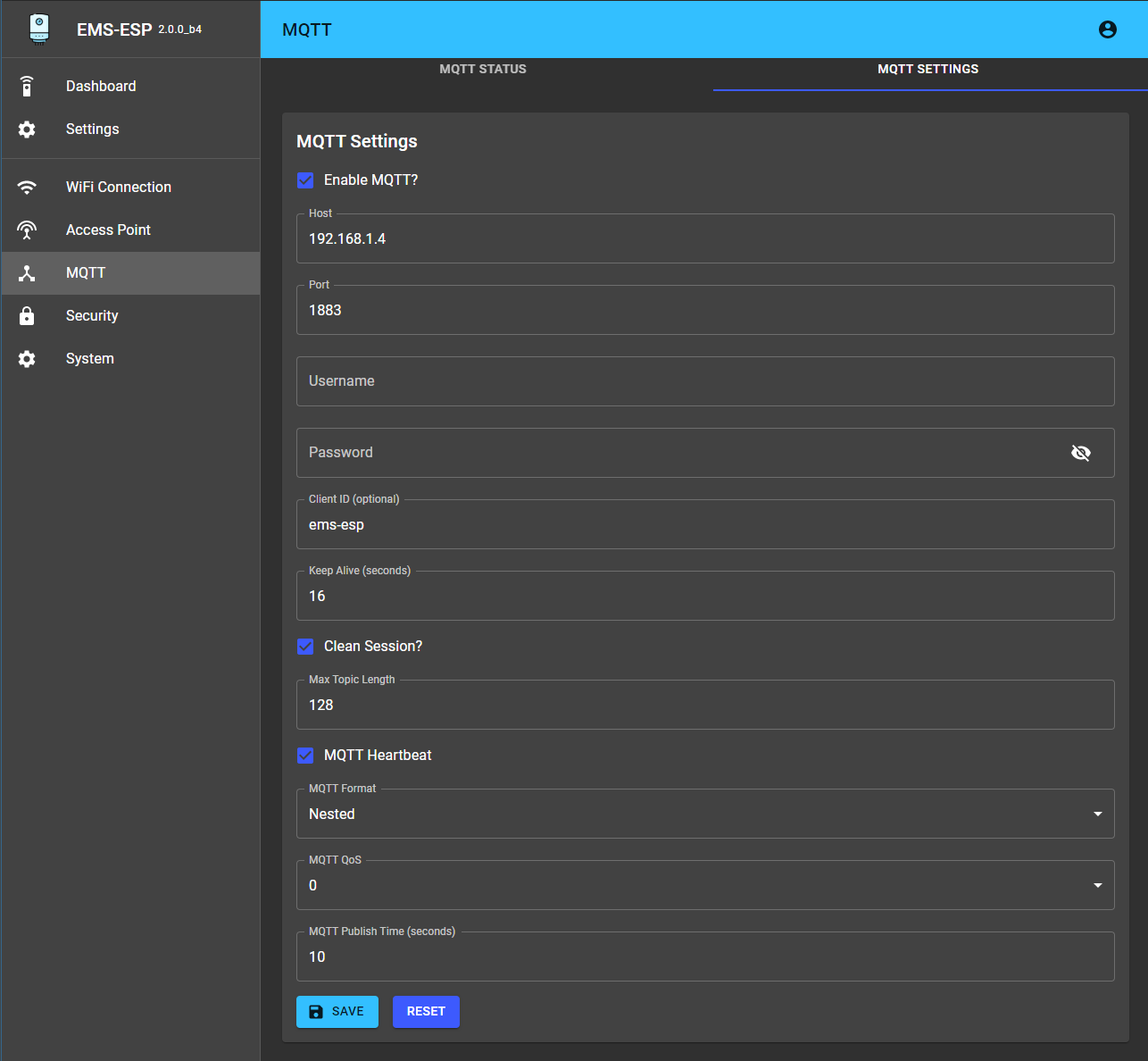 # EMS-ESP version 2.0 ## **New Features in v2** - Supports both ESP8266 and ESP32 - New MQTT option to support Home Assistant MQTT Discovery (https://www.home-assistant.io/docs/mqtt/discovery/) - A new web interface using React and TypeScript that's now secure as each URL endpoint is protected by issuing a JWT which is then sent using Bearer Authentication. - In the Access Point mode there is a web Captive Portal - A new console. As in version 1.9 it works with both Serial and Telnet but now with a more intuitive Linux shell like behavior. It supports multiple connections and has basic security to prevent any changes to EMS-ESP. A full list of commands is below, here are the key ones: * `help` lists the commands and keywords. This works in each context. * `exit` will exit the console or exit the current context. CTRL-D does the same. * `CTRL-U` for Undo * `TAB` for auto-complete * Some specific commands are behind contexts. Think of this as a sub-menu. e.g. `system`, `thermostat`. The path will always show you which context you are in. `$` is the root. * `su` will switch to super-user or Admin. The default password is "ems-esp-neo" and can be changed with `passwd` from the system menu or via the Web UI (called secret password). When in Admin mode the command prompt switches from `$` to `#`. * Some settings can be changed in the console. The `set` command will list them. * `show` shows the data specific to the which context you're in. From the root it will show you all the EMS device information and any external temperature sensors. From a context it will be more specific to that context, e.g. `show mqtt` from `system` will list MQTT subscriptions and show the status and queue. * `log` sets the logging level. `log off` disables logging. Use `log debug` for debugging commands and actions. This will be reset next time the console is opened. * `watch` will output the incoming Rx telegrams directly to the console. You can also put on a watch on a specific EMS device ID or telegram ID. Also choose to output as verbose text or raw data bytes. these in its 'raw' data format and also watch a particular ID. - There is no "serial mode" anymore like with version 1.9. When the Wifi cannot connect to the SSID it will automatically enter a "safe" mode where the Serial console is automatically activated (note Serial is always available on the ESP32 because it has multiple UARTs). The EMS-ESP will blink fast when in Serial mode. Connect via a USB with baud 115200 to see the serial console. Note in this mode the EMS will be disconnect so there will be no incoming traffic. Use only for debugging or changing settings. - The onboard LED behaves like in 1.9. A solid LED means good connection and EMS data is coming in. A slow pulse means either the WiFi or the EMS bus is not connected yet. A very fast pulse is when the system is booting up and configuring itself, which typically takes 5 seconds. ## **Uploading the firmware** - If you're not using PlatformIO, use the command-line and Python. You can download Python from https://www.python.org/downloads/. Make sure you also get: - `esptool`, install using the command `pip install esptool` - and for OTA updates later, `espota` from https://github.com/esp8266/Arduino/blob/master/tools/espota.py using `python espota.py --debug --progress --port 8266 --auth ems-esp-neo -i ems-esp.local -f ` - Grab the latest firmware binary from https://github.com/proddy/EMS-ESP/releases/tag/travis-v2-build - Uploading directly via USB. For ESP8266: `esptool.py -p -b 921600 write_flash 0x00000 ` note: if this fails try a lower speed like `115200` instead of `921600`. For ESP32: `esptool.py --chip esp32 --port "COM6" --baud 921600 --before default_reset --after hard_reset write_flash -z --flash_mode dio --flash_freq 40m --flash_size detect 0x1000 XX\.platformio\packages\framework-arduinoespressif32\tools\sdk\bin\bootloader_dio_40m.bin 0x8000 XX\.pio\build\esp32\partitions.bin 0xe000 XX\.platformio\packages\framework-arduinoespressif32\tools\partitions\boot_app0.bin 0x10000 ` - Uploading over WiFi: `espota.py --debug --progress --port 8266 --auth ems-esp-neo -i -f ` ## **Setting EMS-ESP up for the first time** - Connect to the Access Point called ems-esp using the WPA password `ems-esp-neo`. When you see the captive portal sign-in with username `admin` and password `admin`. Set the WiFi credentials and go back to http://ems-esp - First thing to check is if Tx is working and that you have a connect to the EMS bus. If it's showing an error try changing the Tx Mode from the settings page. Then check the Status (no need to restart EMS-ESP). ## **The Console** Connecting to the console will give you more insight into the EMS bus traffic, MQTT queues and the actual device information. The console is reachable via Telnet (port 22) or via the Serial port if using an USB (on baud 115200). To change any settings in the console you must be admin (use `su` with the default password `ems-esp-neo`). On an ESP8266 the Serial port is disabled by default unless it's unable to connect to the WiFi. The `call` command is to execute a command. The command names (`[cmd]`) are the same as the MQTT command listed in the next section. (* = available in su/Admin mode) ``` common commands available in all contexts: exit help log [level] watch [ID] su (from the root) system (enters a context) boiler (enters a context) thermostat (enters a context) set fetch scan devices [deep] * send telegram <"XX XX ..."> * set bus_id * set tx_mode * show show devices show ems show values show mqtt system set show format * show users * passwd * restart * set wifi hostname * set wifi password * set wifi ssid * wifi reconnect * pin [data] * boiler read * call [cmd] [data] * thermostat set set master [device ID] * read * call [cmd] [data] [heating circuit] * ``` ---------- ## **MQTT commands** Breaking change: The MQTT base has been removed in version 2. The hostname is only used as prefixed to the topic, e.g. `ems-esp/status`. Al
